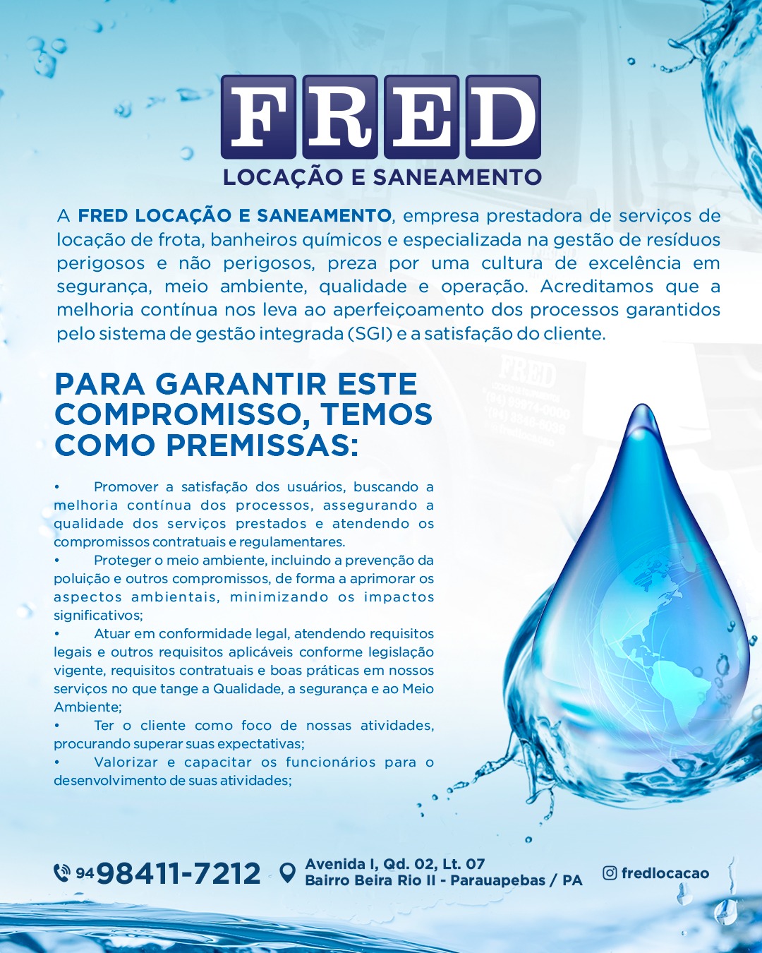 Através de um sistema de gestão da qualidade nos padrões estabelecidos por nossa administração, a FRED LOCAÇÃO tem como foco principal o atendimento aos requisitos e a satisfação das necessidades dos clientes, além da melhoria contínua de seus processos internos.